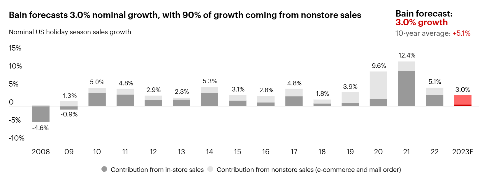 A Bain & Company prevê um crescimento nominal de 3% nas vendas no retalho dos Estados Unidos da Améria este Natal, o menor desde 2018.