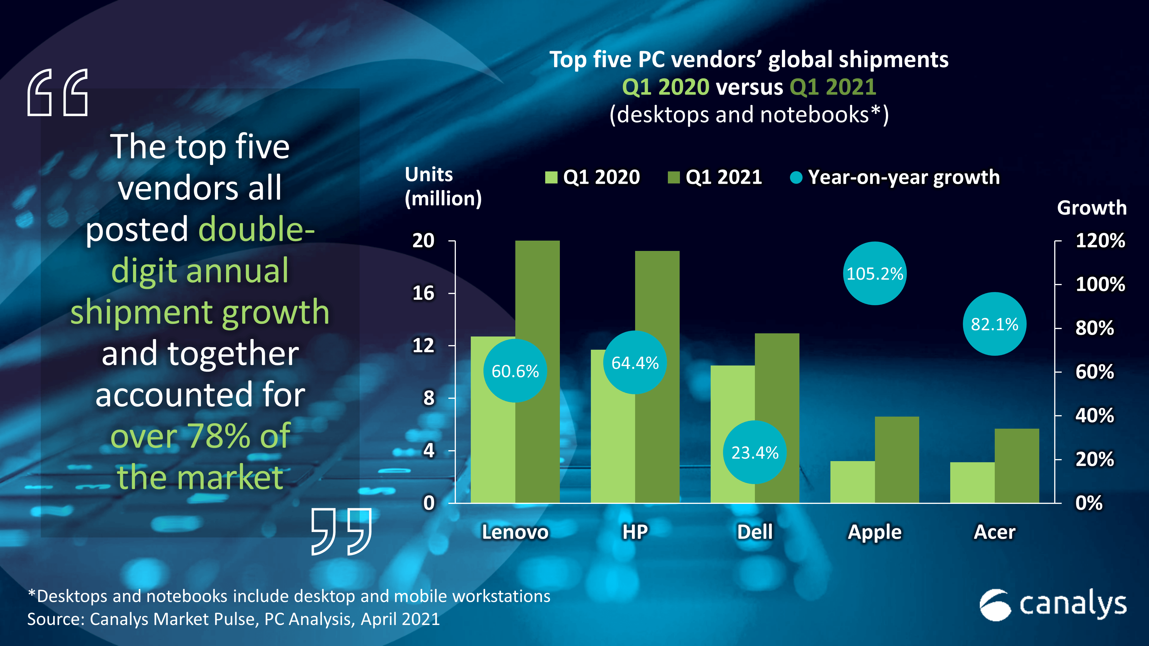 Os mais recentes dados da Canalys mostram que o mercado mundial de computadores portáteis (não inclui tablets) continuou a crescer fortemente no primeiro trimestre de 2021, com as encomendas de desktops, notebooks e estações de trabalho a crescerem 55%.